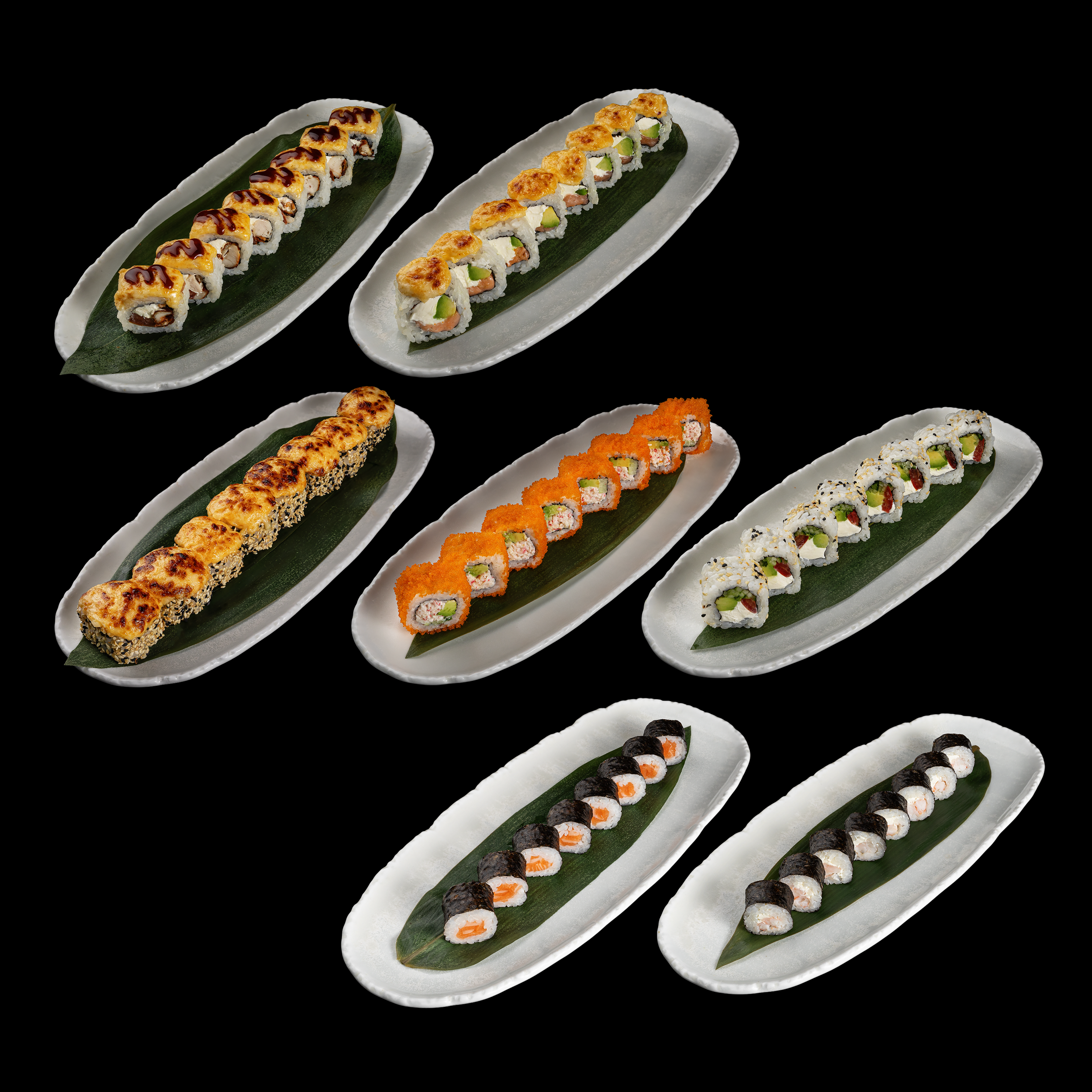 Suši rīsi, tīģergarneles, kimči burkāni, gurķis, avokado, čili, daikons, nori čipsi, sweet chilli fusion mērce, ponzu mērce, melnās sezama sēklas