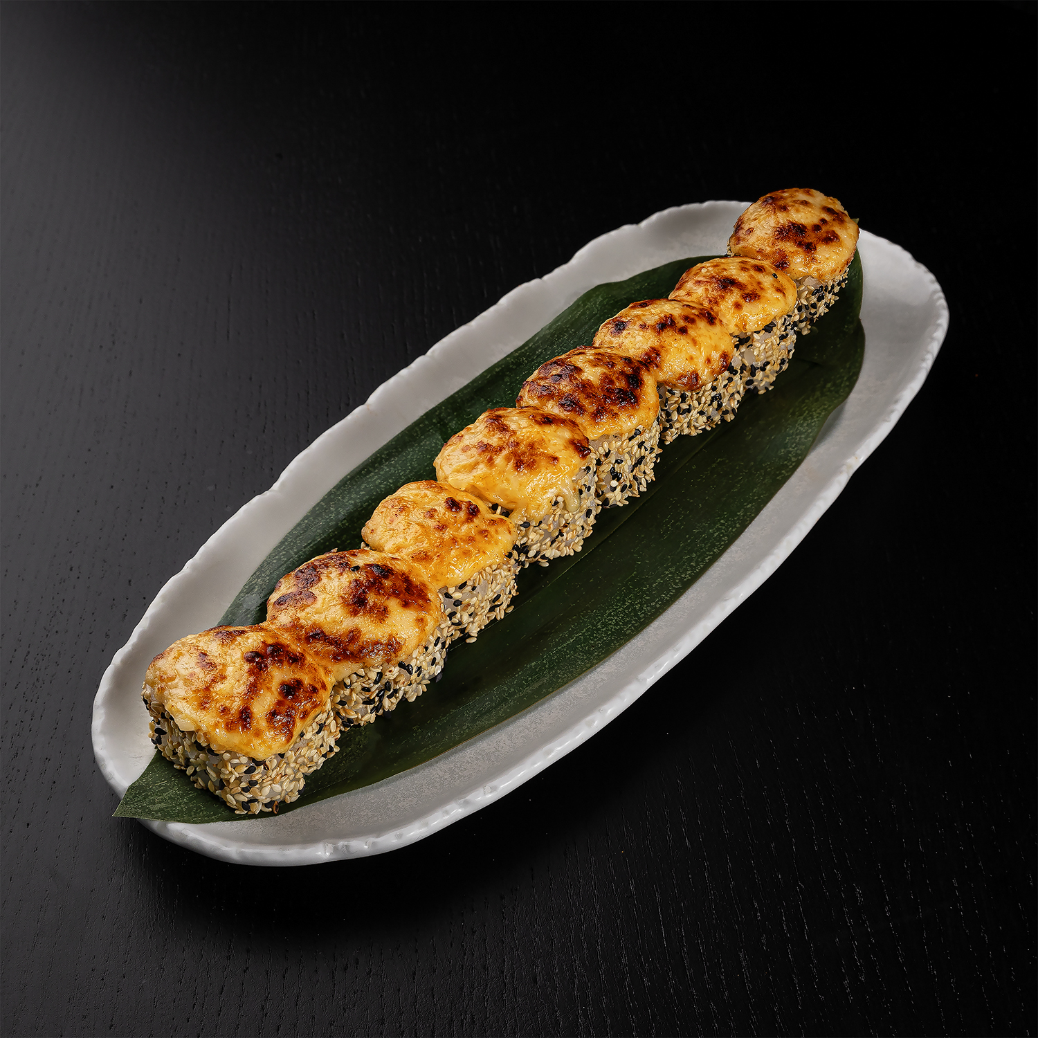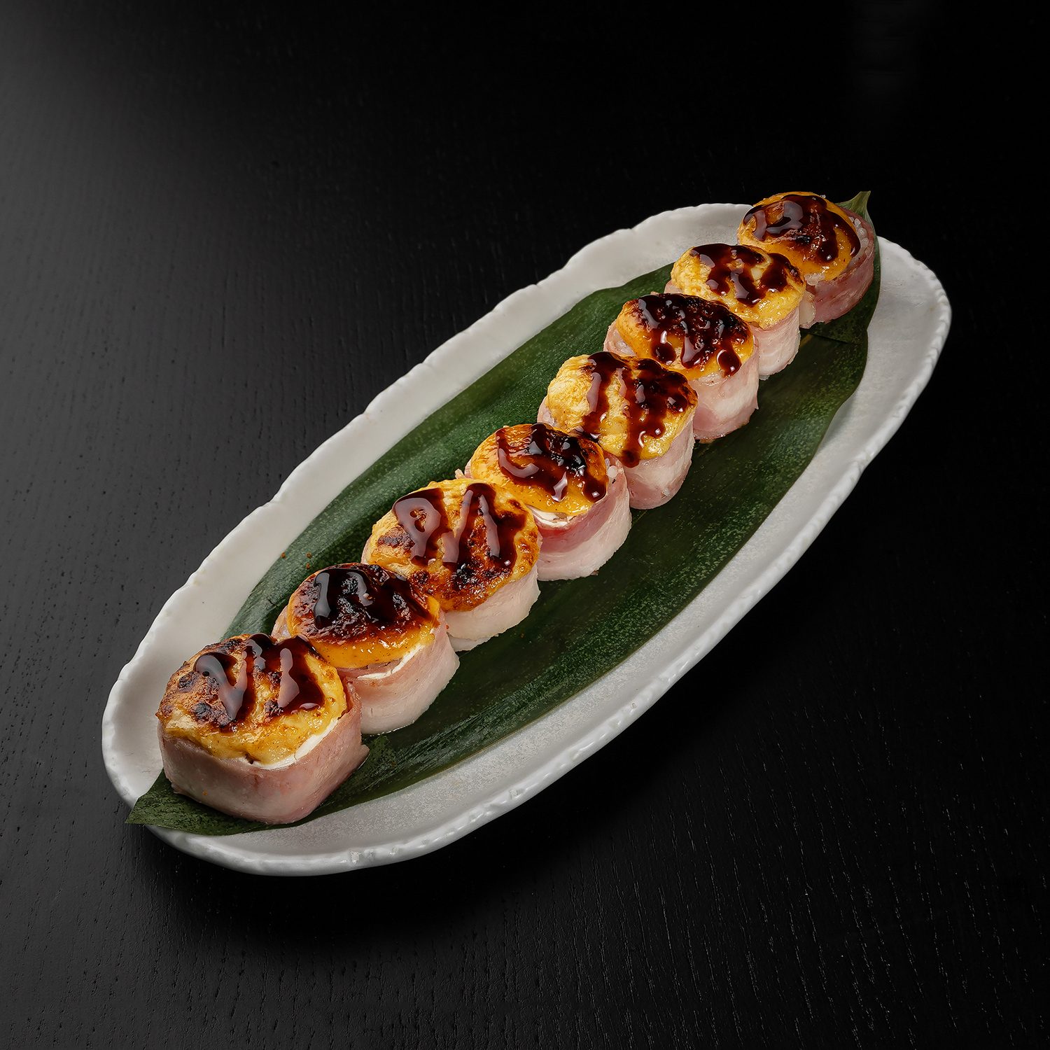 Cepts lasis teriyaki mērcē, siera cepurīte, gurķis, spicy mērce, masago ikri, kraukšķīgi sīpoli