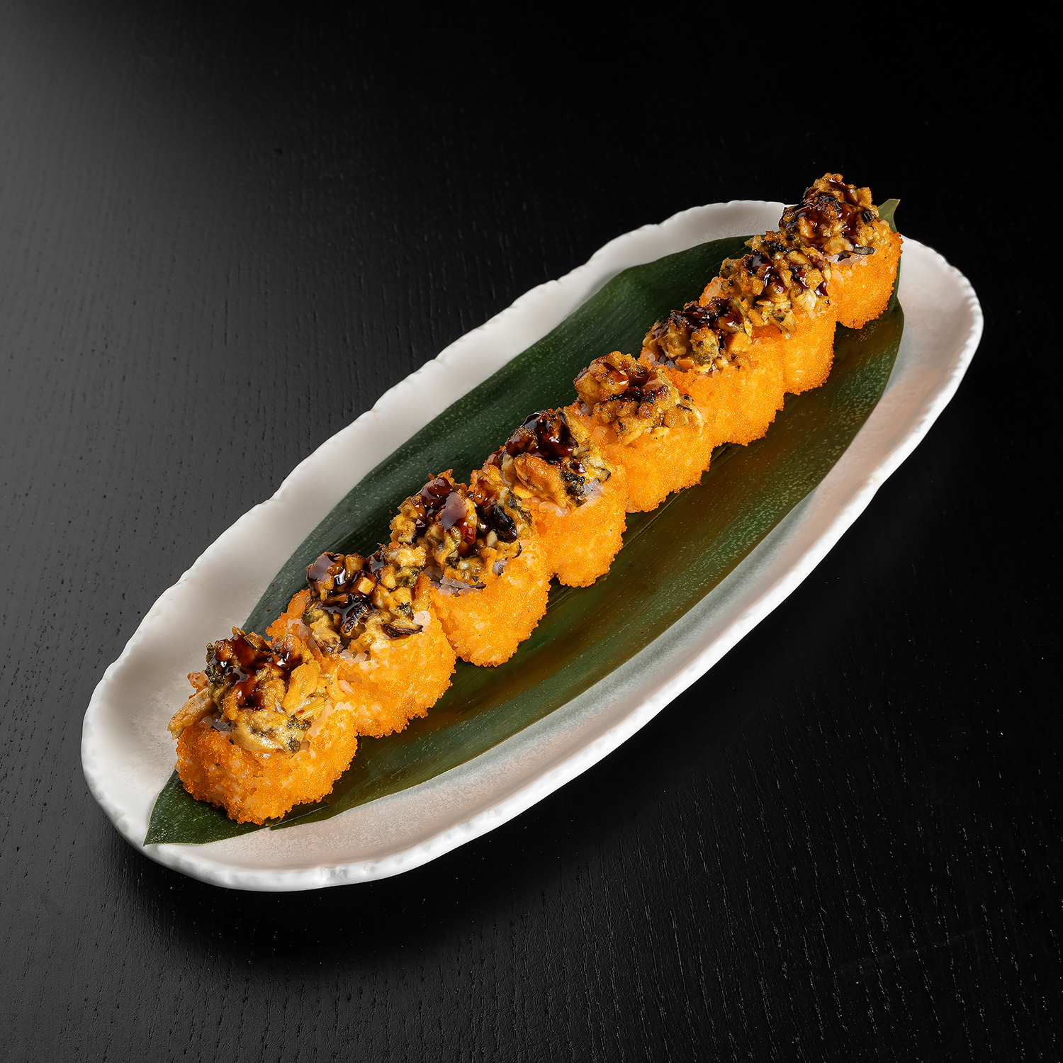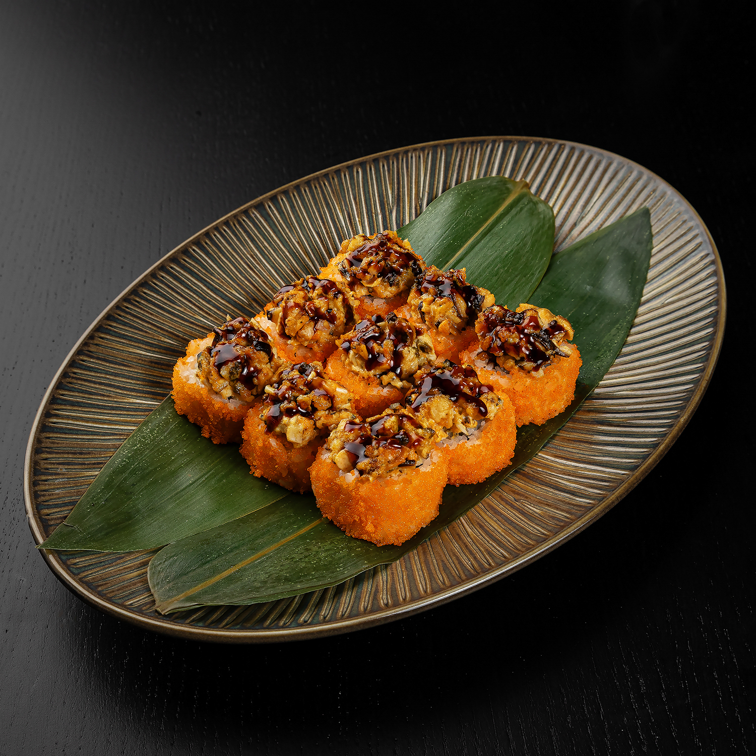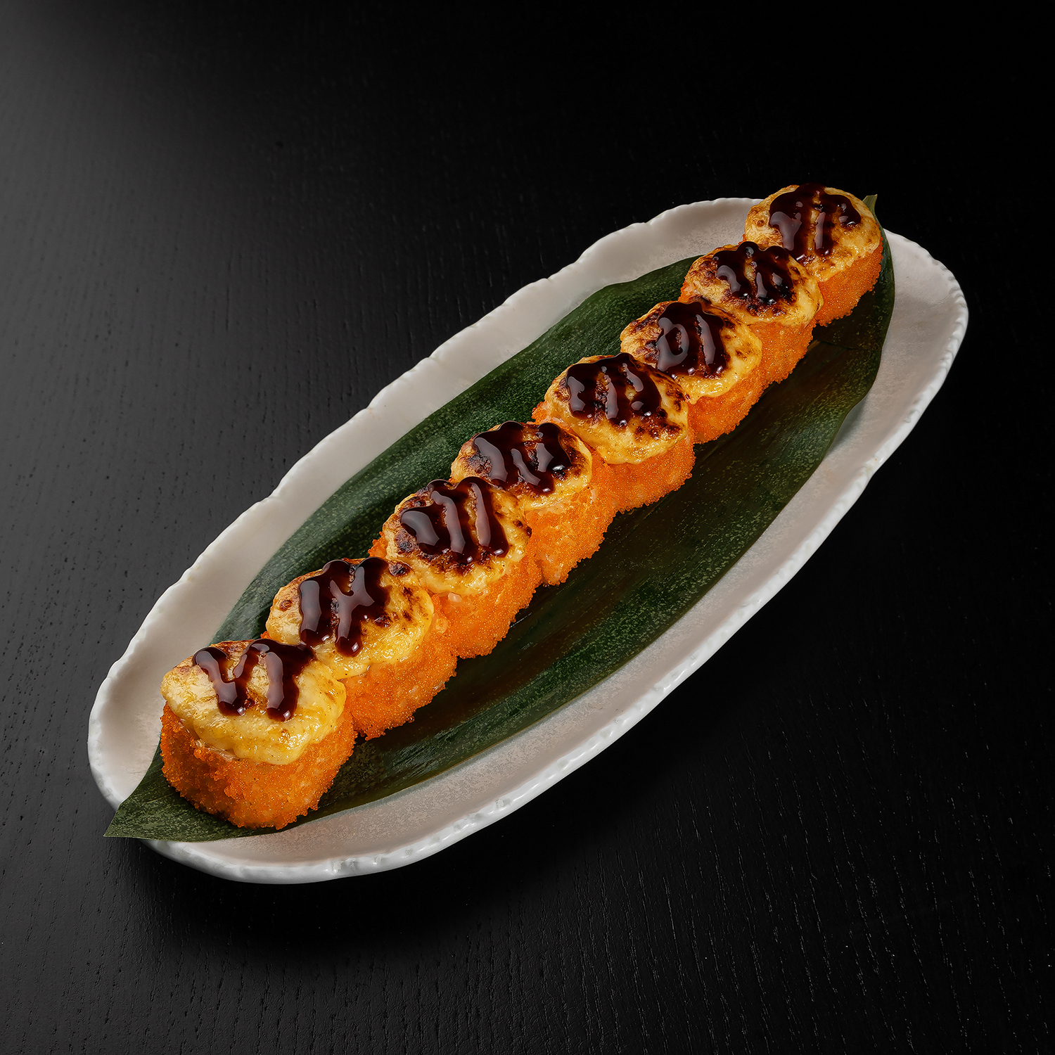 Tīģergarneles, mīdijas, siers, masago ikri, spicy mērce, teriyaki mērce