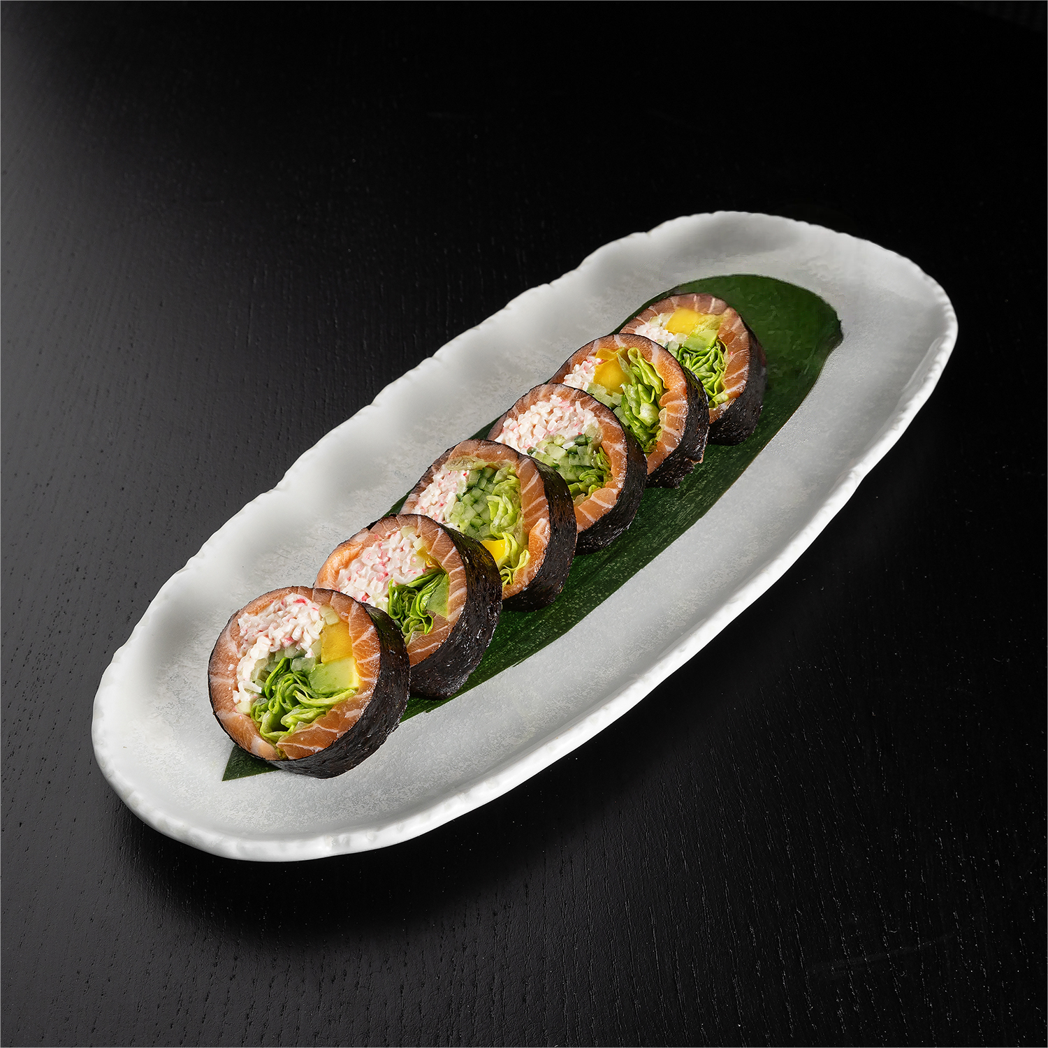 Lasis, tīģergarnele, mango, avokado, gurķis, masago ikri, siers, nori
